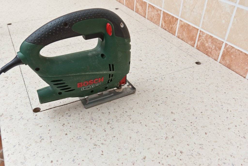 Вырезать отверстие с помощью лобзика намного проще, но штука в том, что без дрели здесь также обойтись достаточно трудно – понадобится просверлить одно единое отверстие для пилки. В принципе, при сильном желании это отверстие можно проковырять вручную – кроме того, в столешницу можно врезаться и самим лобзиком, правда для этого понадобится определенная сноровка