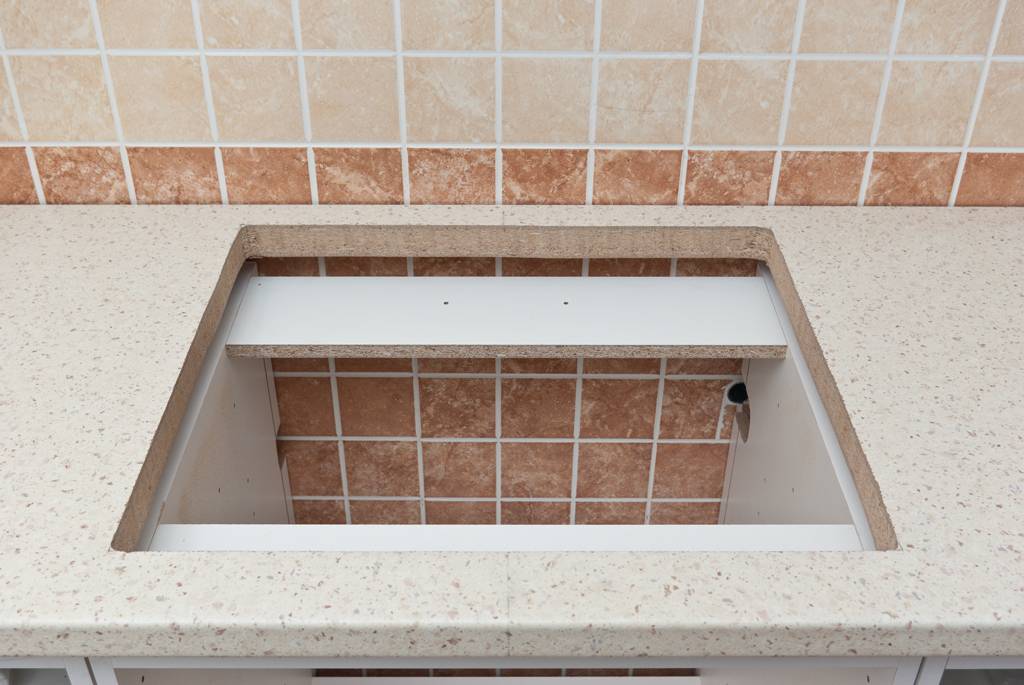 В процессе выпиливания придерживаем удаляемую часть столешницы снизу, чтобы избежать преждевременное её падение и скол декоративного покрытия. Дополнительных вентиляционных отверстий не требуется.