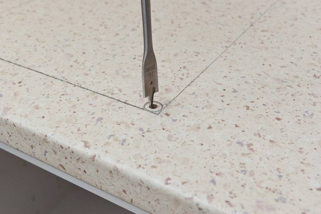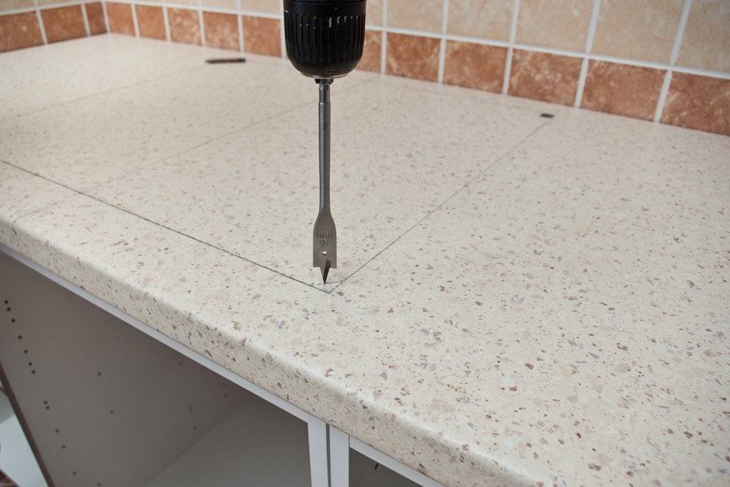 После того, как отверстие будет готово, в обязательном порядке нужно выполнить его гидроизоляцию – при попадании воды или даже просто влаги в торец столешницы имеется очень большая вероятность того, что материал, из которого она изготовлена, разбухнет, и столешница испортится. Как правило, торец выреза обрабатывают силиконом. Если вы вырезали отверстие дрелью, то сделать это качественно будет достаточно сложно – придется повозиться.