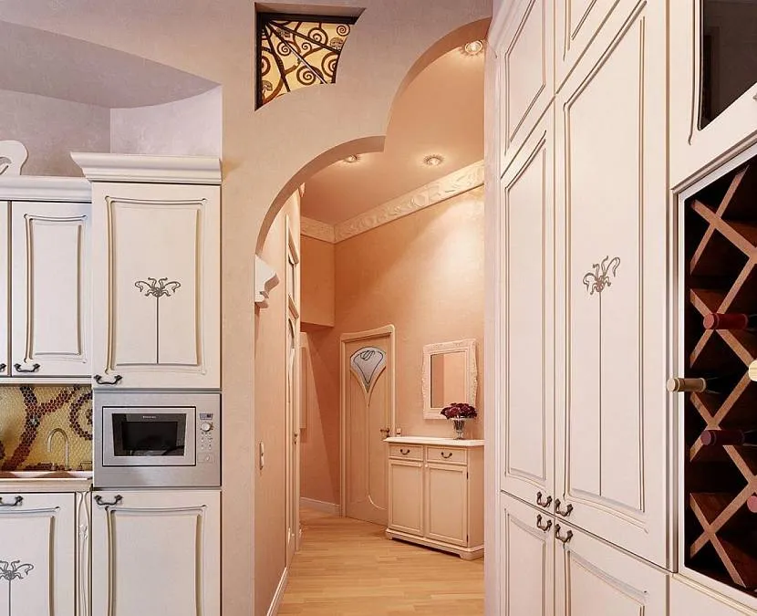 Арку на кухню желательно выполнить в стиле, гармонирующем с дизайном самой кухни и смежным с ней помещением. Вариантов оформления арочного проема множество, и они ограничены только вашей фантазией.