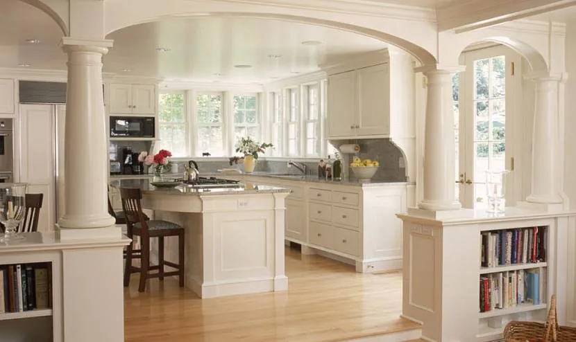 Кухню в античном стиле гармонично дополнит арка с лепниной, оформленная в единой цветовой гамме с кухней. Арочный проем в виде колон, украшенных лепниной, также идеально подойдет для античной кухни.