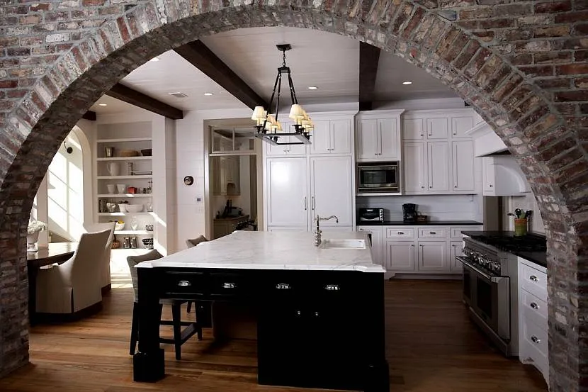 - Фигурный свод в большой кухне желательно акцентировать в контрастных тонах. Эффектно смотрится отделка структурной штукатуркой.
