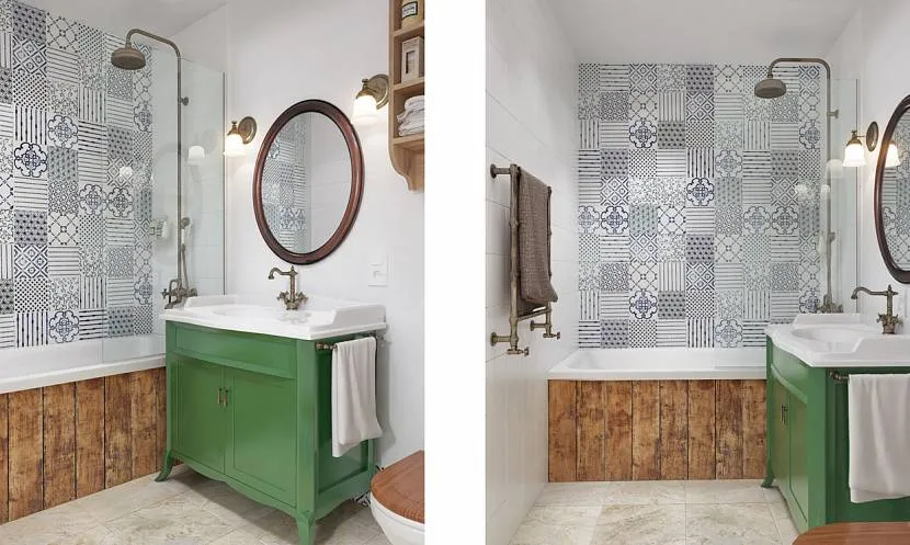 - Иногда может подойти стиль кантри. Ему присуще использование грубоватой мебели. Например, ванная, сделанная в таком стиле, будет напоминать дубовую бадью. Можно использовать плетённую бадью, отделку под дерева и неяркий тёплый свет.