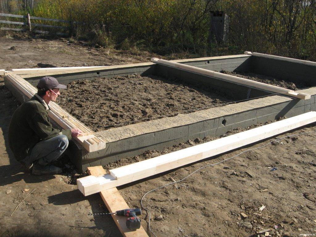 Работы возобновляются после снятия опалубки. Снимаем плодородный слой почвы и монтируем канализационный трап с приёмником стоков – пластиковую или металлическую трубу. Труба должна иметь уклон для естественного слива воды. Основание бани засыпаем 10-сантиметровым слоем песка, сверху – слоем гравия или керамзита толщиной 15 см. Грунт тщательно уплотняем. Затем укладываем решётку из металла для армирования. Делаем стяжку: подготовленную поверхность заливаем бетоном толщиной 15 см.