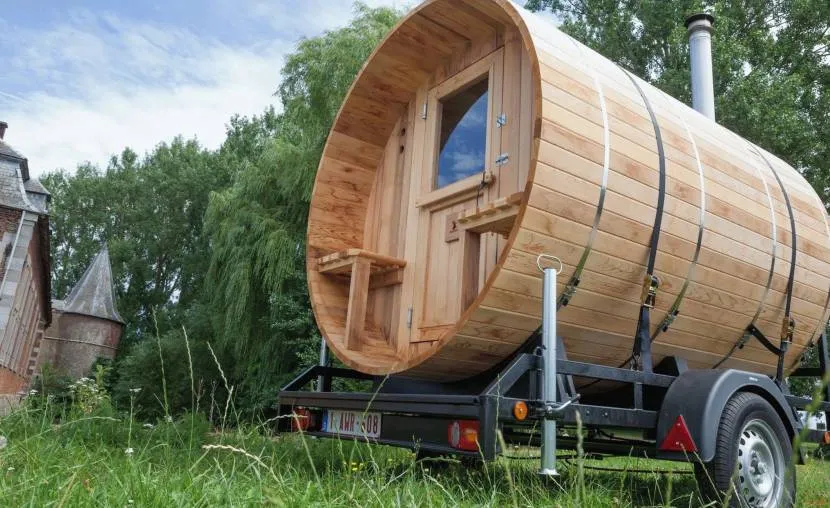 Парильня, возведённая на базе рамы-платформы на колёсах, пользуется спросом, поскольку её можно снимать/загружать по мере необходимости.