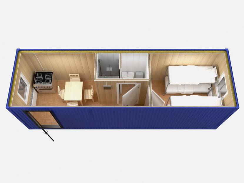 Строителей можно заселить в домик, план которого представлен ниже. В нем есть все для проживания 4 человек, включая санузел с душем и кухню. Такая постройка может быть утепленной и предназначенной для эксплуатации в зимнее время.