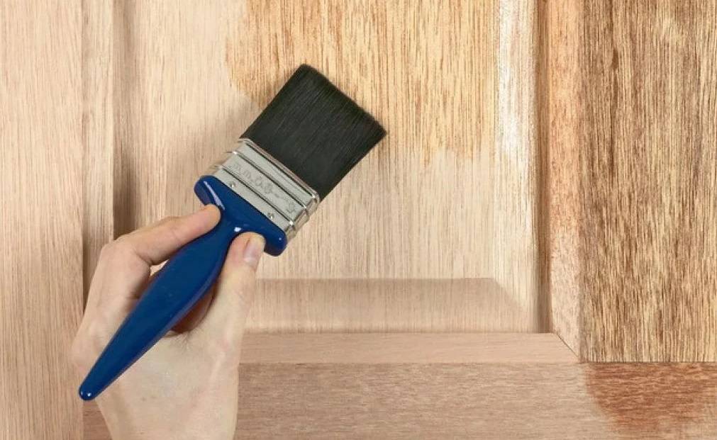 Прежде чем, как покрасить деревянную дверь морилкой и обработать ее сверху лаком, поверхность необходимо хорошо смочить водой. Это необходимо проводить вместо грунтования. Такая процедура повысит проницаемость морилки глубоко в структуру древесины.