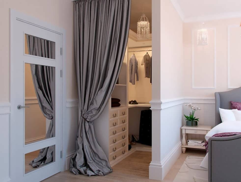 Используя ткани вместо обычных дверей в шкафу, нужно учитывать, что в гардеробной придется поддерживать идеальный порядок.