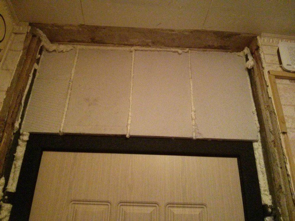 Все зазоры, которые образовались, следует задуть монтажной пеной. После этого нужно пройти деревянным бруском по всему периметру нанесения пены, чтобы выровнять поверхность. Далее следует вырезать из гипсокартона ровные части, которые будут соответствовать длине дверного проема. При этом нужно учесть, что ширина гипсокартонного отрезка должна быть на 5 см больше, чем глубина дверного проема.