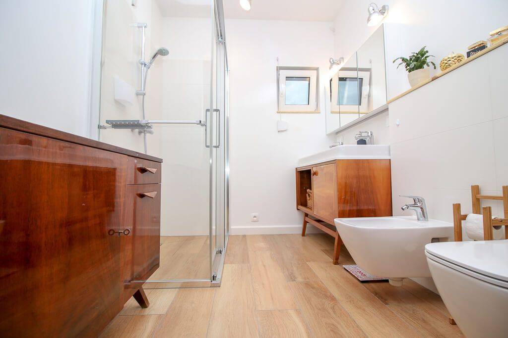 Основные плюсы – это полная экологичность, что важно для ванной комнаты, и тёплая, уютная атмосфера. Дерево используется в виде вагонки, панелей, клеёной доски или массива