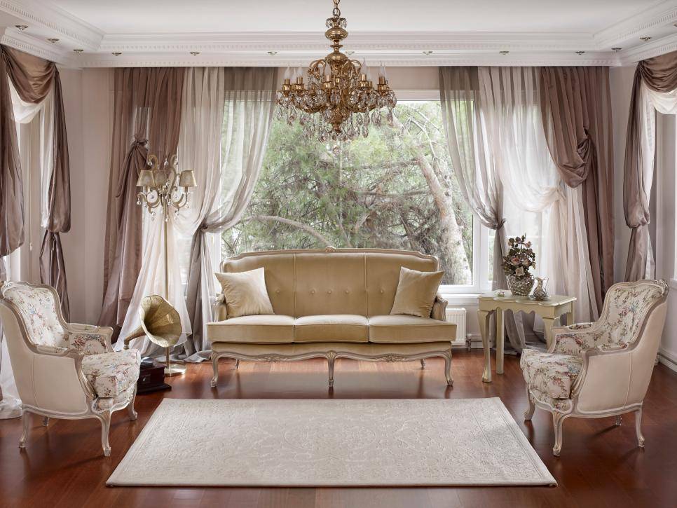 На дизайн штор влияет назначение комнаты, особенности интерьера. К примеру, громоздкие гардины в стиле барокко уместны в гостиной, но на кухне, в прихожей будут выглядеть вызывающе. Классика подходит для любого помещения. Используют легкие занавески и плотные прямые шторы. Только идентичное оформление. Разноплановый текстиль будет выглядеть нелепо. Исключение составляют окна в комнате, разделенной на зоны.