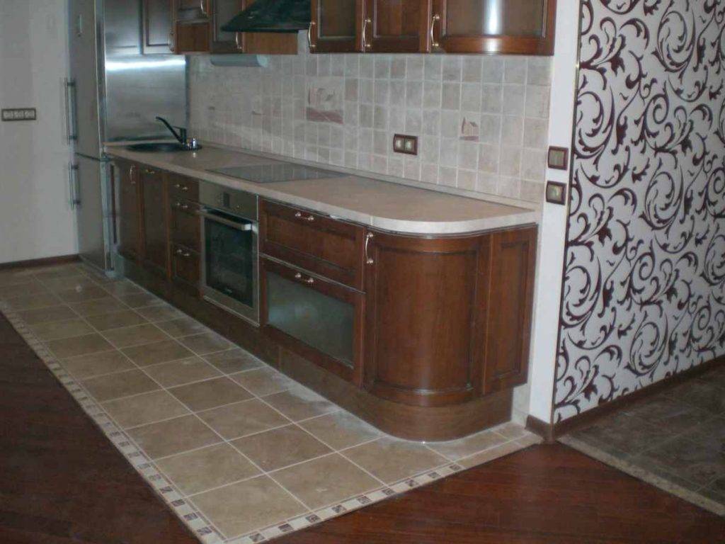 Если на кухне достаточно большие окна, а стены и потолок выполнены в светлых тонах, темную мебель дополняют коричневым ламинатом, сочетающимся со светлой плиткой. При таком сочетании часть напольной поверхности, покрытая плиткой, выглядит более широкой, визуально расширяя границы кухонного пространства.