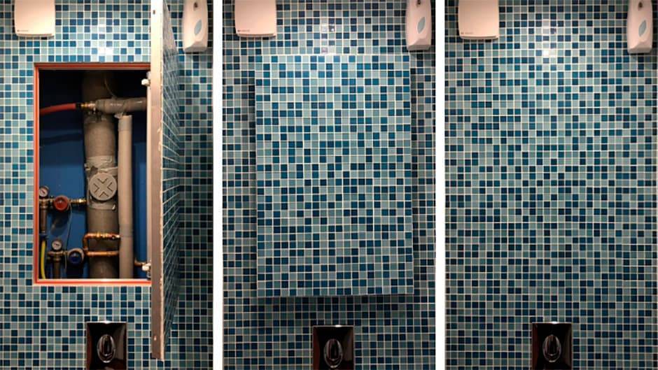 - Керамическая облицовка лючка укладывается в одной плоскости с остальной облицовкой стен.