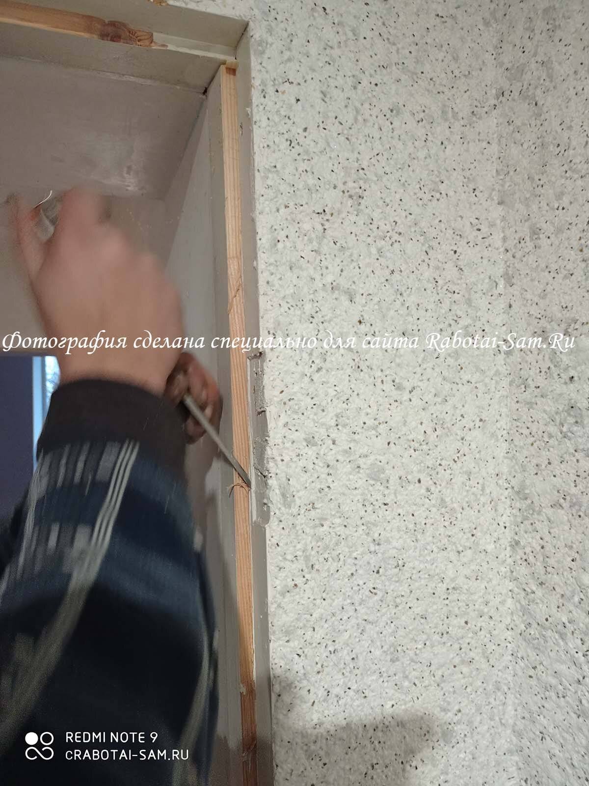 - Доска должна быть нужной ширины. Отрезают ее по длине на 50 мм меньше высоты дверного проема. В верхней части вырезают четверть шириной 50 мм и глубиной 20 мм для горизонтальной части. По бокам проема пристреливают степлером полоски из джута, оставляя брус свободным, чтобы не накрутился на саморезы. Вставляют доски в проем и выравнивают по уровню. Прикручивают саморезами 65-75 мм длины насквозь к бруску, утапливая в полотне, при этом следят, чтобы не прошить брусок насквозь. Места крепления шпаклюют.