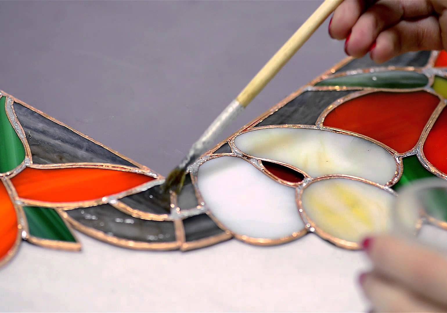 Витражные красящие вещества закрепляются специальным лаком, который предназначен для данных средств.