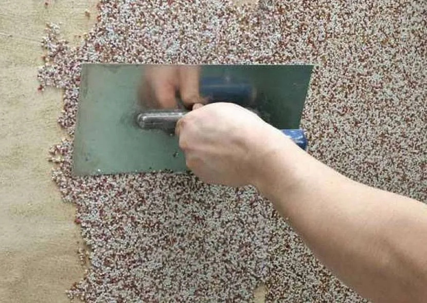Нанесение металлической теркой декоративной мозаичной штукатуркиИсточник kraski-net.ru