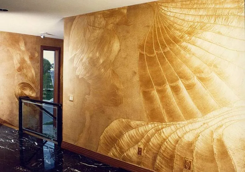 Из ticiana можно свободно формировать декоративные поверхности с необычным или, как говорят, высоким рельефом рисунка. Это могут быть хаотичные или упорядоченные гребни, волны, широкие ряды полос и борозд. Многое зависит от стиля оформления стен. Тонированная смесь легко лессируется и подвергается поверхностной доработке кисточкой или валиком. Прозрачный фирменный лак Тициане можно тоже подвергнуть тонировке специальным наполнителем, дающим перламутровый отлив или легкий золотистый, или бронзовый тон.