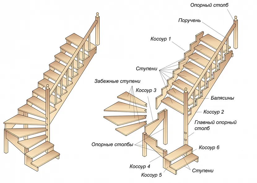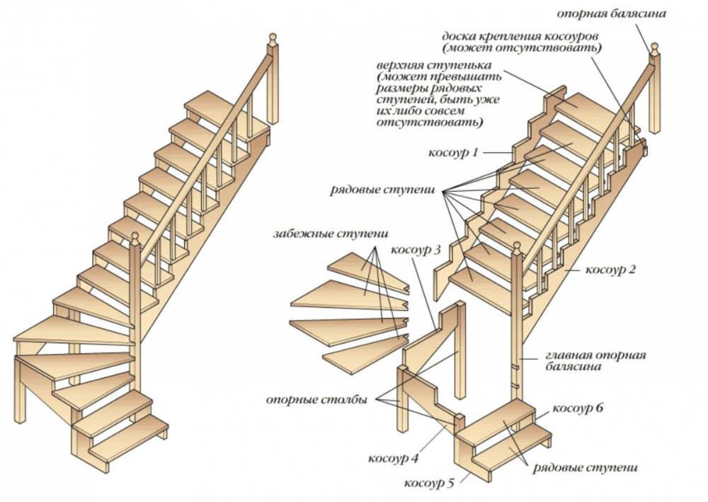| Косоуры | Прочные балки, служащие опорой ступеням. Ступеньки нижней плоскостью опираются о вырезанные горизонтальные площадки в этих балках. |