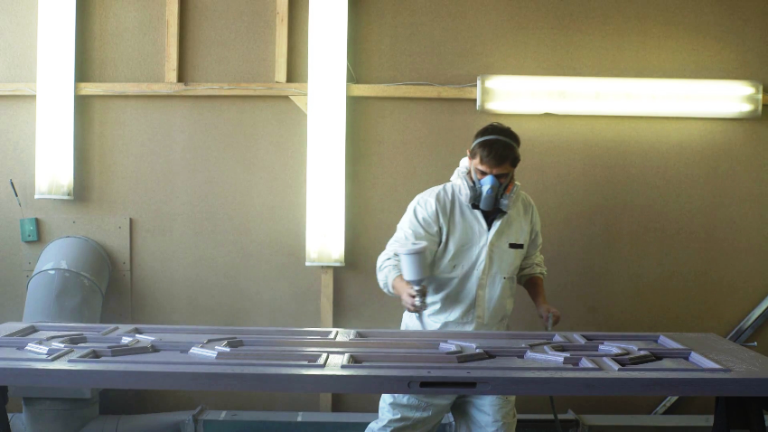 - Покраска. Для изготовления дверей лучше применять лакокрасочные материалы на водной основе, поскольку у них менее неприятный запах. Наносить краску нужно специальной кистью, хорошо растирая ее по поверхности дерева.