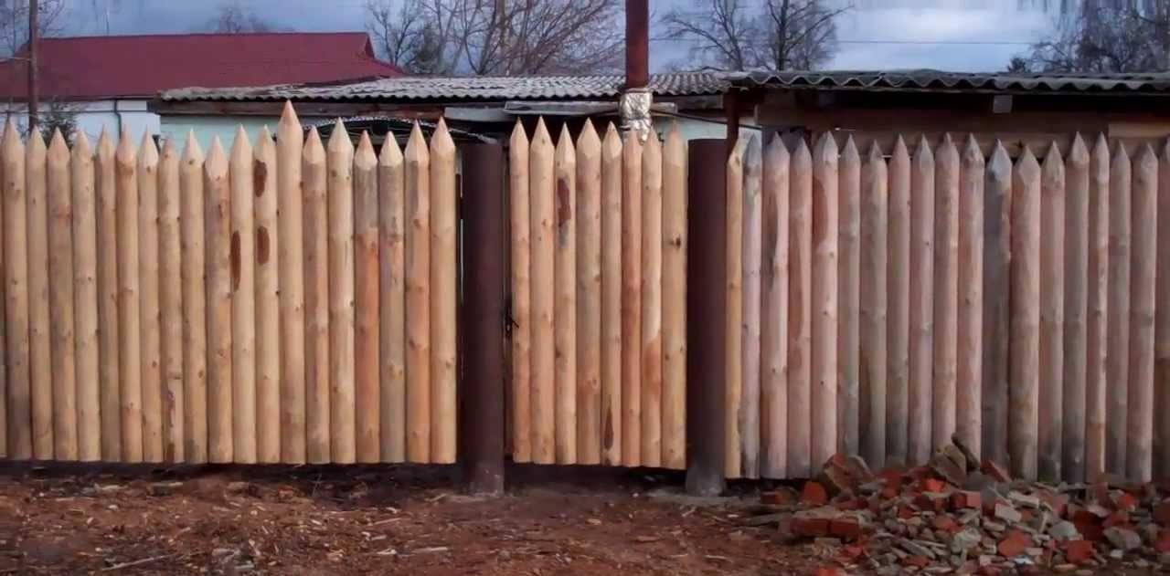 Прочный деревянный забор, имеющий внушительный внешний вид. Изготавливается из вертикально поставленных деревянных кольев, заточенных в верхней части под углом 40 градусов.