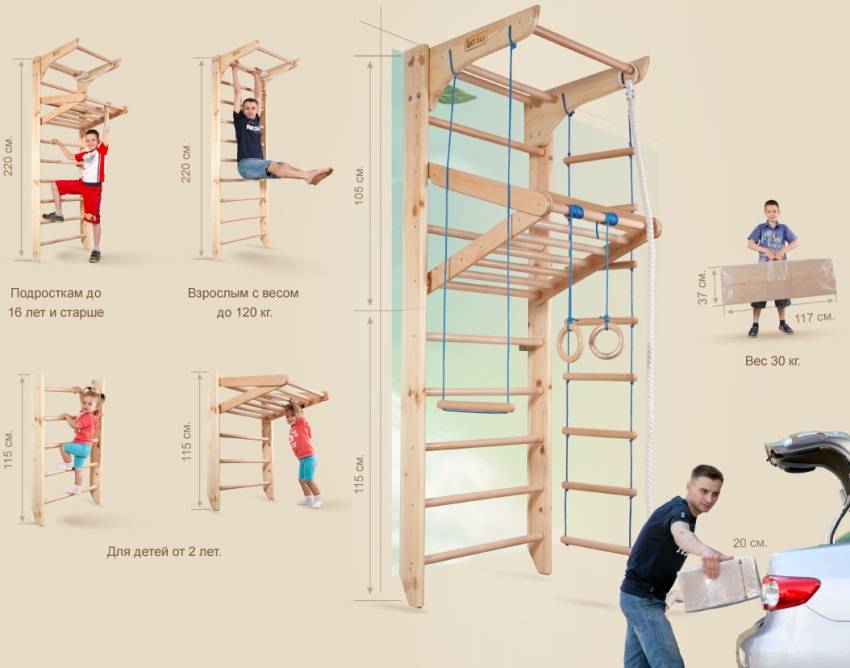 - комплекс трансформер может использоваться в двух вариациях. В собранном состоянии он имеет вид шведской стены, а в разобранном превращается в рукоход с дополнительными снарядами;