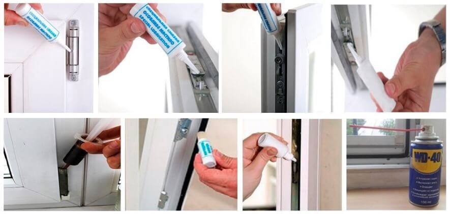 Важно не выбирать инструмент с грубым ворсом, чтобы не повредить пластиковый профиль; Обильно смазывают кронштейны, запорные части и металлическую фурнитуру. Для обработки мест трудного доступа используют специальные трубочки, которые идут в комплекте множества растворов для смазки; При использовании смазки без трубки каждую деталь смазывают несколькими каплями