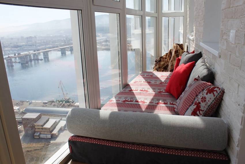 Большинство балконов и лоджий не могут похвастаться большими размерами. Преимущественно они имеют прямоугольную форму. Ширина помещения не превышает 1,5 м. Такая планировка исключается вариант расположения дивана вдоль длинной стены, поскольку мебель перекроет свободный проход. Оптимальным решением станет установка диванчика возле короткой боковой стены.