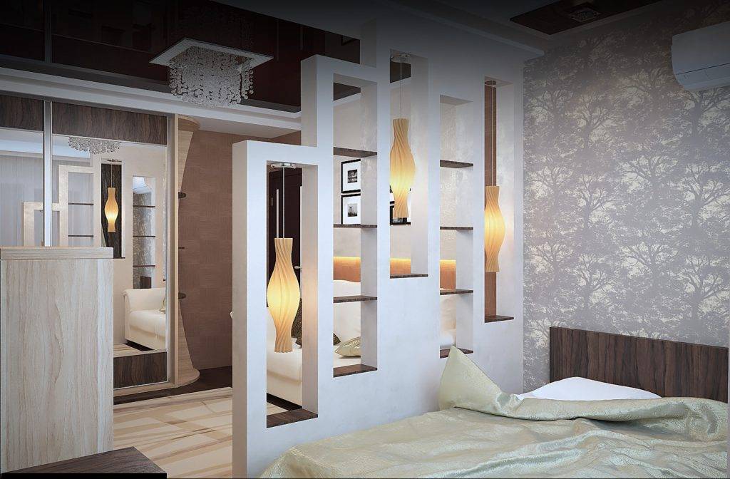 В роли перегородки послужит конструкция из гипсокартона, дерева и других материалов с различными нишами, полками, подсветкой. Перегородка может «разбить» пространство на две самостоятельные комнаты, или лишь частично скрывать одну зону от другой, выступая в роли ширмы.