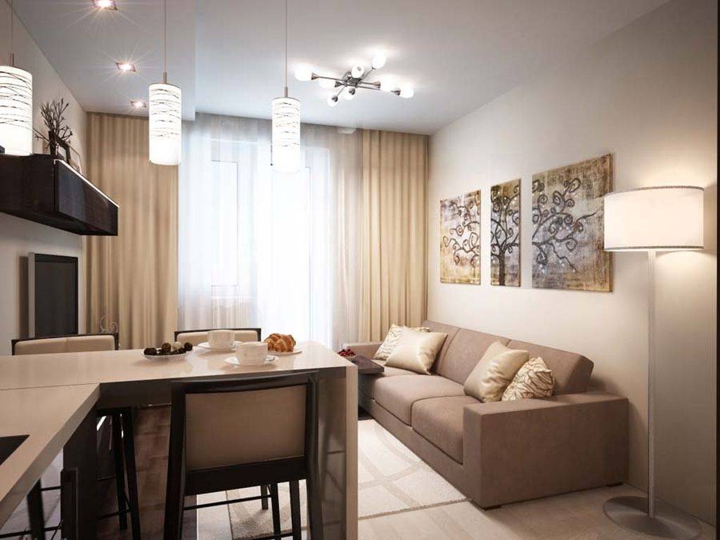 С целью получения дополнительного пространство зал нередко объединяют с кухней. В современных квартирах-студиях эти два помещения уже объединены, а вот в панельных домах часто приходится сносить стену полностью или частично. Если же квартира однокомнатная, то гостиная совмещается со спальней.