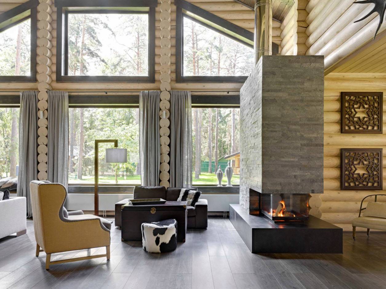 При обустройстве гостиной нужно учитывать количество окон, уровень освещения, число дверных проемов, наличие лестницы и саму конфигурацию комнаты. Для частного дома подходят такие стили, как:
