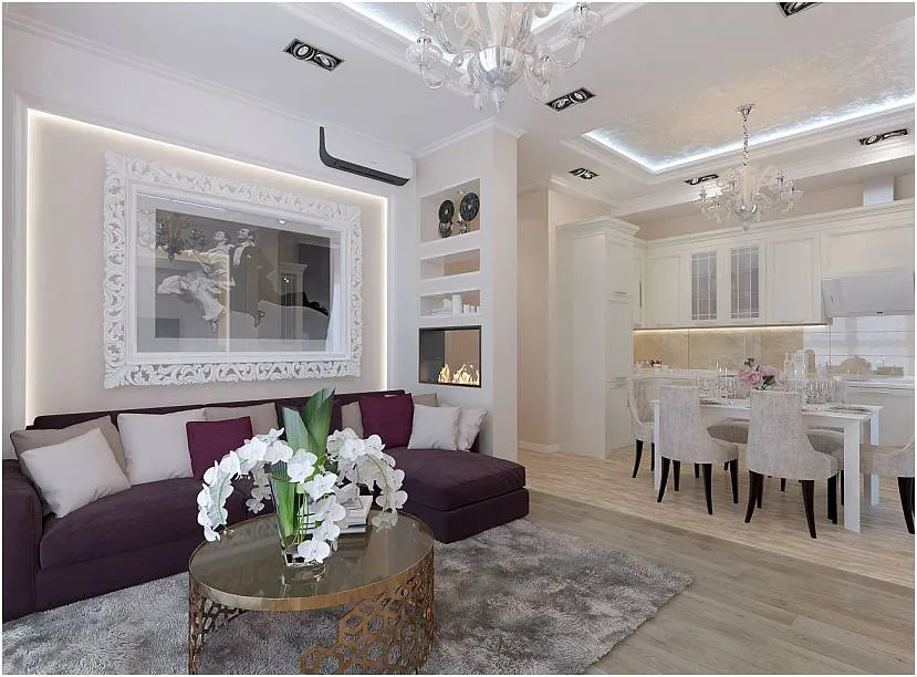 Освещение. Удачным подбором и размещением ламп можно зонировать комнату и подчеркнуть ее дизайн. Над кухонной зоной устанавливают точечные светильники, а над рабочей поверхностью — светодиодную ленту. Над обеденным столом закрепляют подходящий по стилю осветительный прибор. Гостиную освещают более разнообразно; подойдут настенные и напольные светильники, люстра.