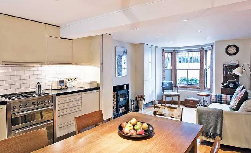 В маленькой комнате хорошим вариантом будет разделение кухни и гостиной при помощи небольшого стола