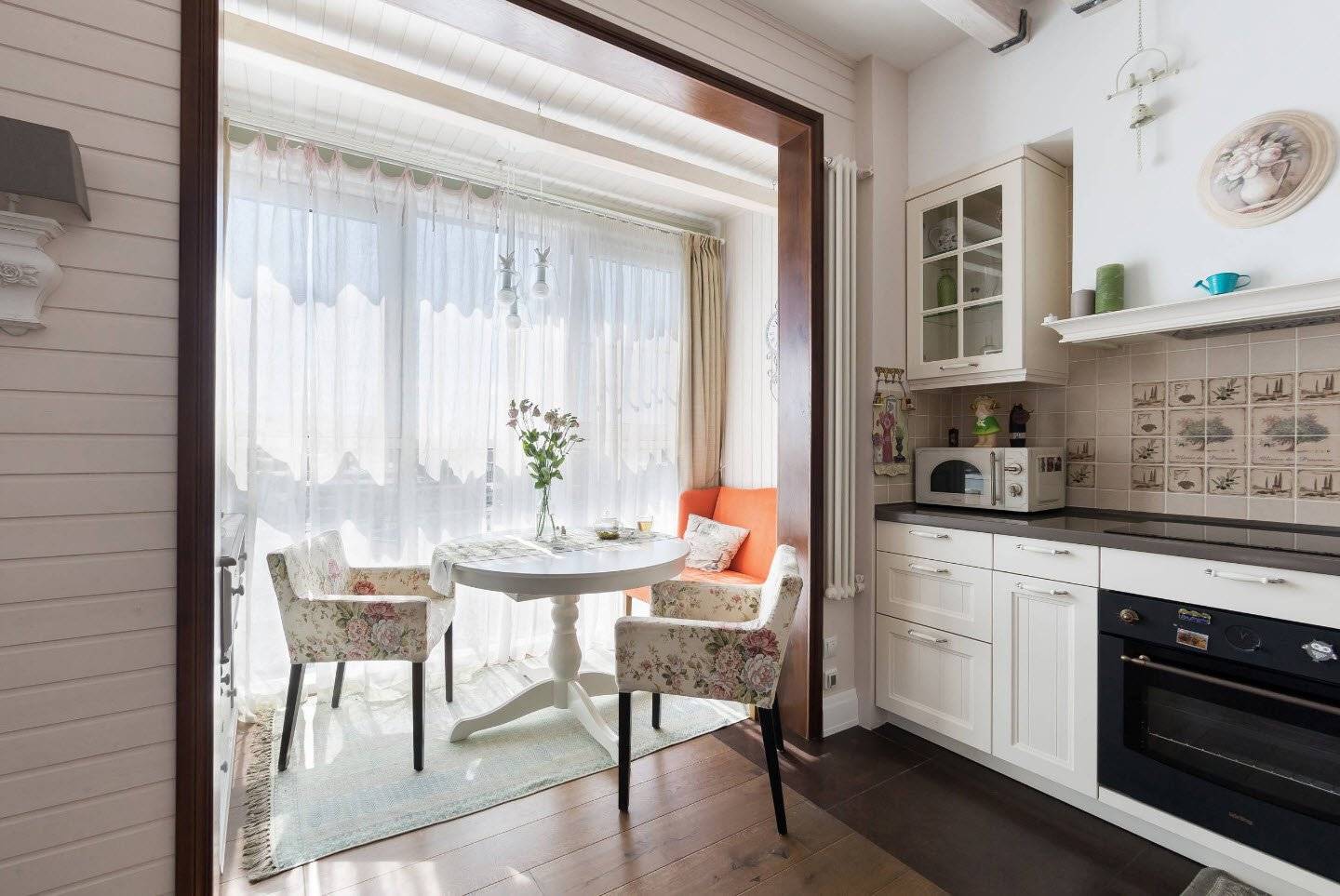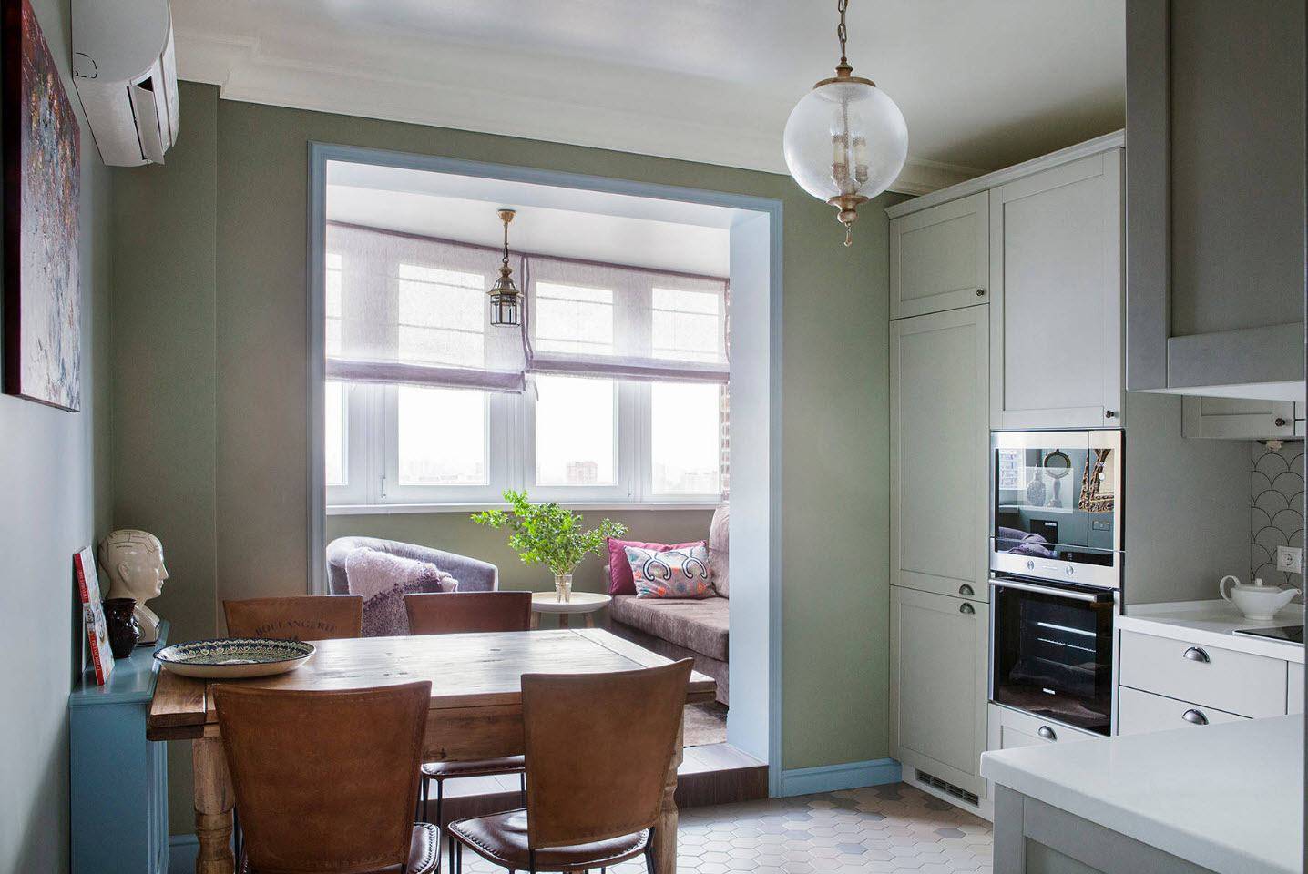 Если лоджия находится со стороны кухни, то хорошим решением будет, объединить их в одно помещение, в результате чего получится достаточно просторная кухня – студия со столовой зоной на балконе.