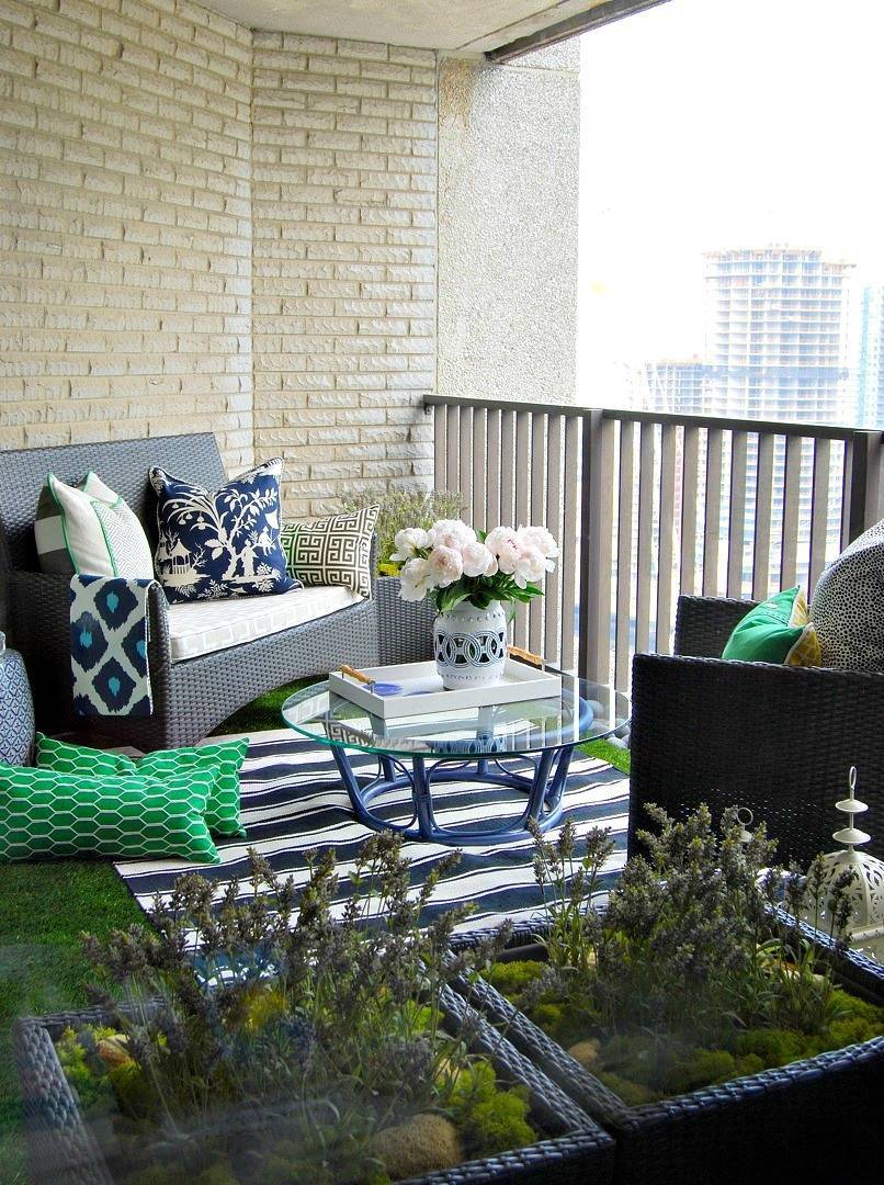 Светлые оттенки, мелкие принты, полосы добавят объема даже небольшому балкончику – возьмите на вооружение этот прием для обустройства.