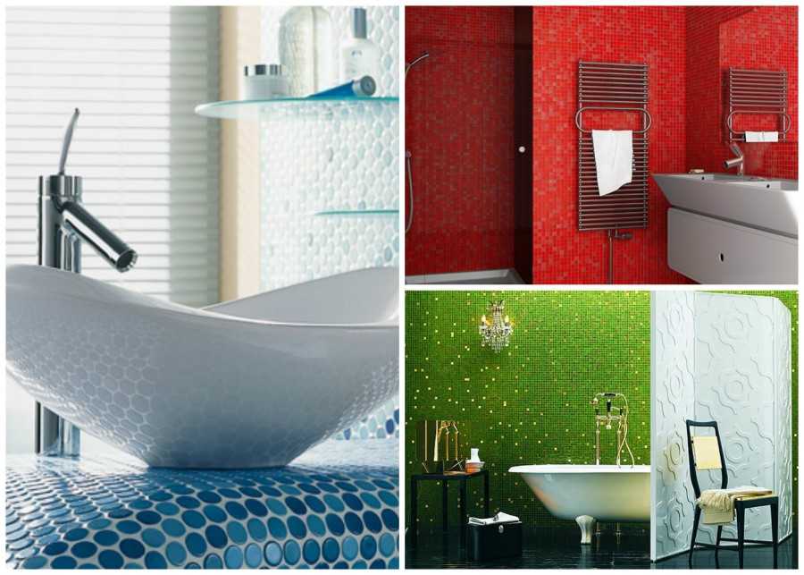 В небольших ванных комнат мозаикой оформляется полностью все помещение. В просторных помещениях плиточной мозаикой отделывается пол или организуется зонирование комнаты.