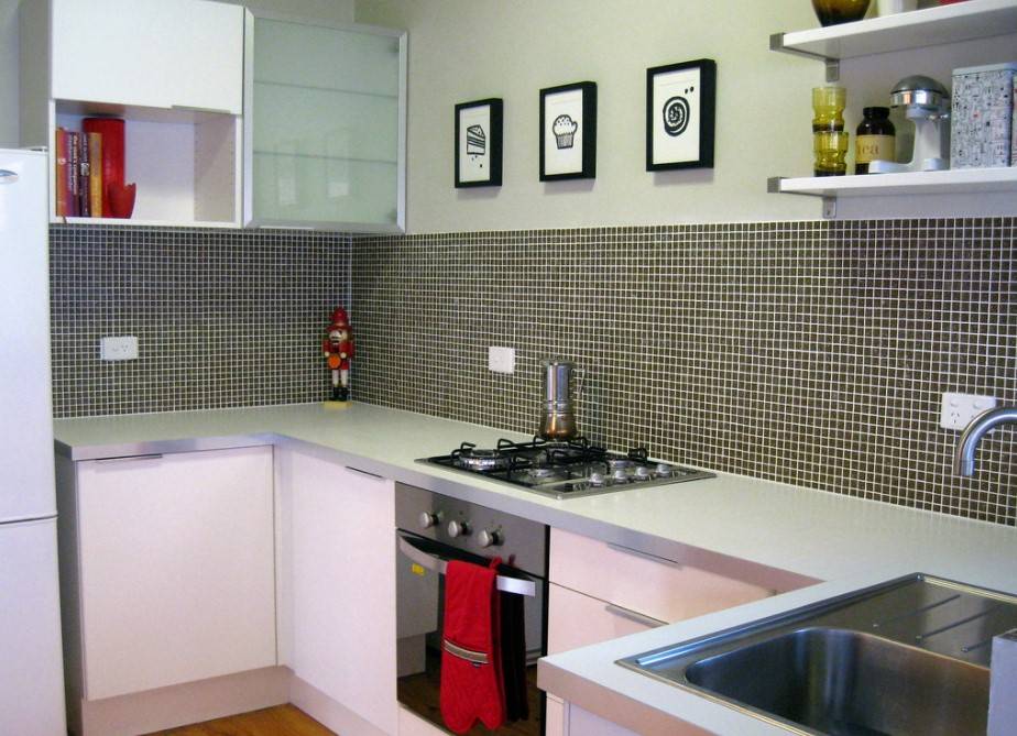 Самый популярный вариант внедрения мозаики в интерьер кухни – отделка фартука. Также можно укладывать плитку на пол в зоне для готовки.