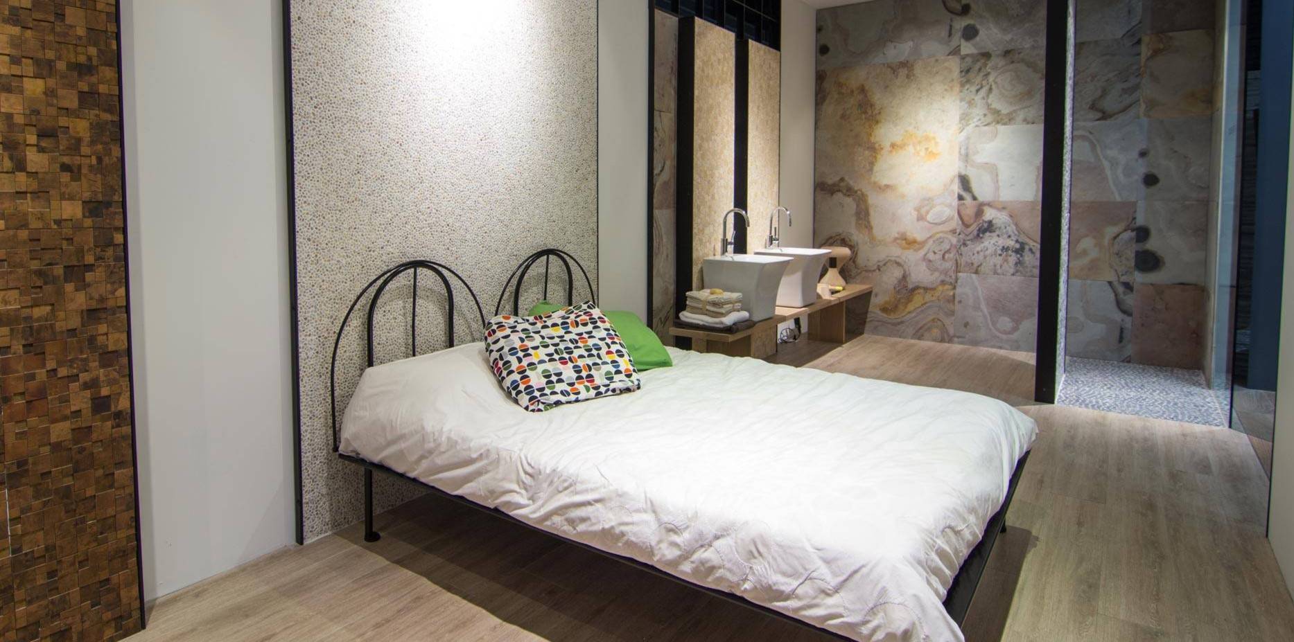 Для создания комфортной обстановки в спальне лучше оформлять мозаикой пол, зону над изголовьем кровати и ниши. В редких случаях выполняется декорирование потолка и зонирование помещения с помощью мозаики.