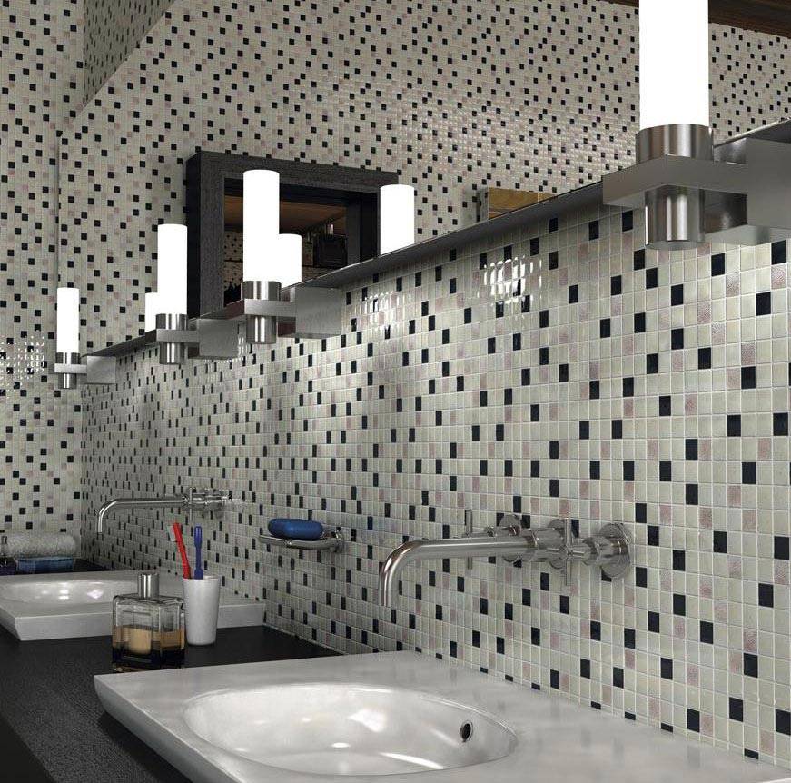Именно с этого помещения началось массовое использование мелкой плитки в интерьере. Дизайнерам так захотелось альтернативы скучному и приевшемуся кафелю, что стеклянные панно, обладающие такой же прочностью, но более утонченным видом, пришлись по вкусу. Небольшие размеры выгодно гармонируют с привычными тесными комнатами санузлов.