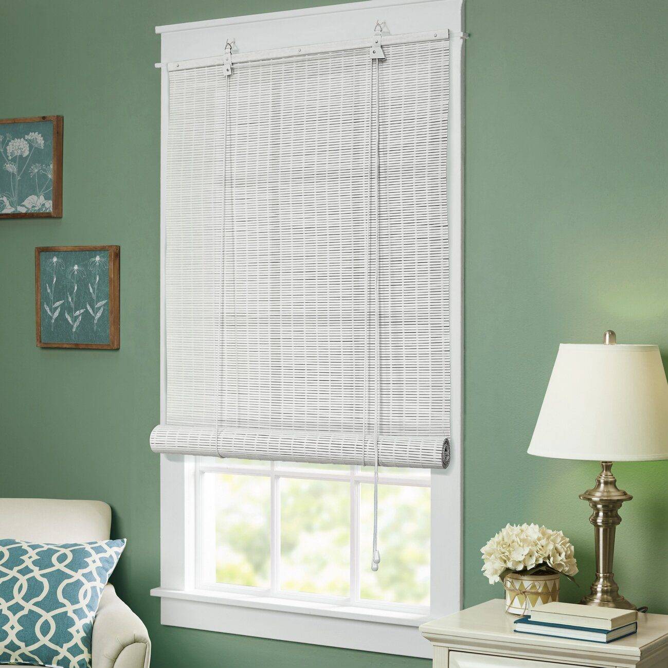 На фото интерьер гостиной с горизонтальными бамбуковыми ламелями на окнах.