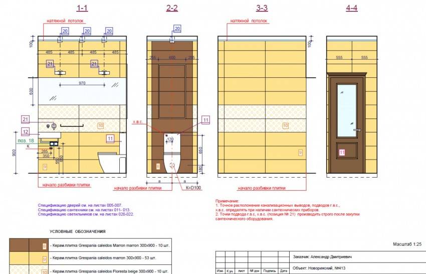 Для того, чтобы сделать правильную раскладку кафельной плитки в ванной, нужно обязательно сделать точные замеры. Их следует производить согласно учета всех дверных проемов, ниш, а также всех имеющихся ниш. Все значения должны быть подписанными на схеме.