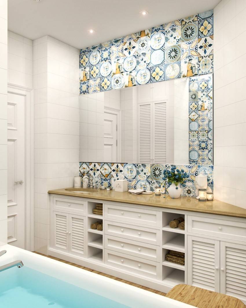На фото интерьер ванной со стеной, облицованной мозаикой с рисунками в стиле гжель.