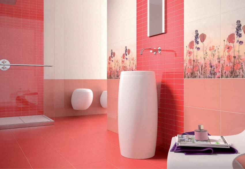 Если же базовым элементом станет простая плитка белого или любого другого спокойно цвета, то стоит разбавить его небольшими яркими красками. Сочетание плитки в ванной в двух цветах всегда смотрится гармонично и стильно.