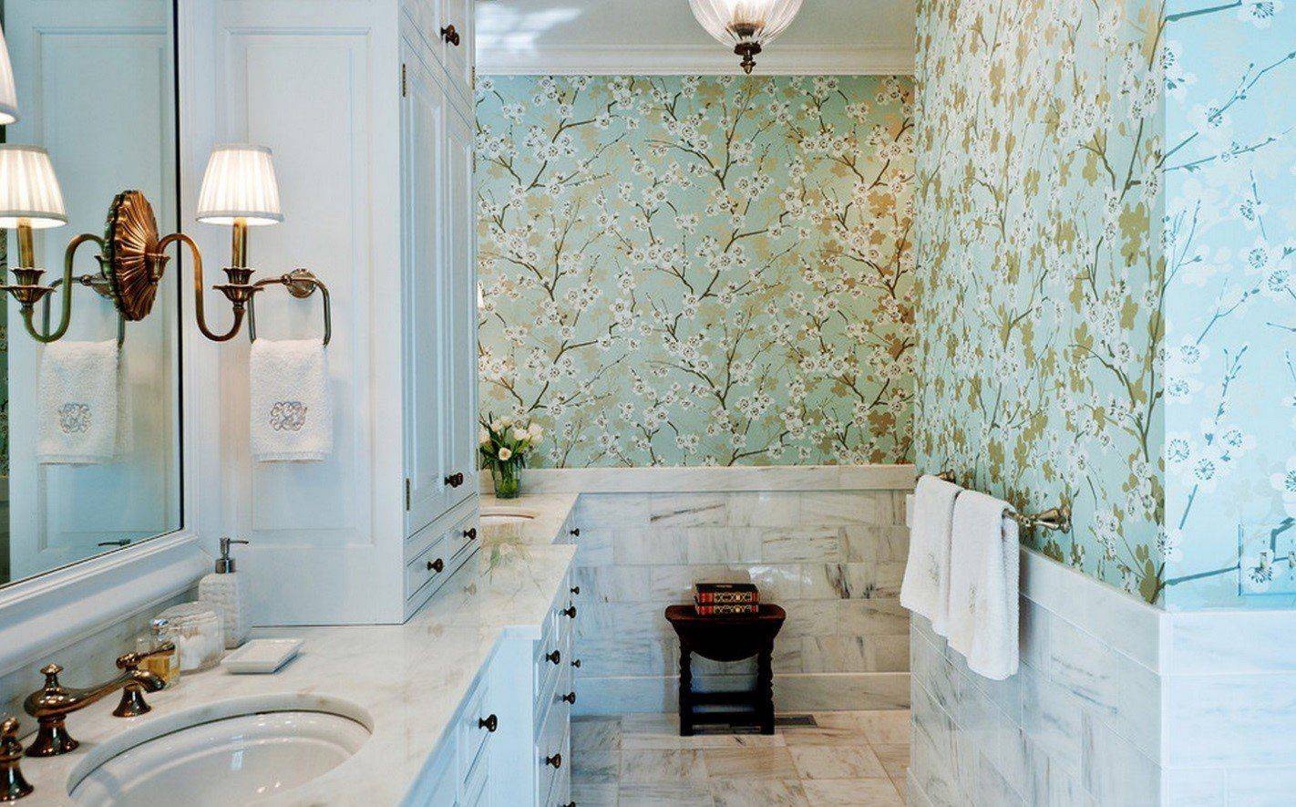 Если плитка надоела, хочется нового и необычного – обратите внимание на обои, устойчивые к сырости и перепадам температур (виниловые, жидкие или стекловолокнистые). Даже такие обои не переносят прямых контактов с водой, поэтому клеить их нужно подальше от раковины, ванной и душа