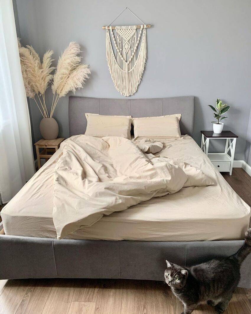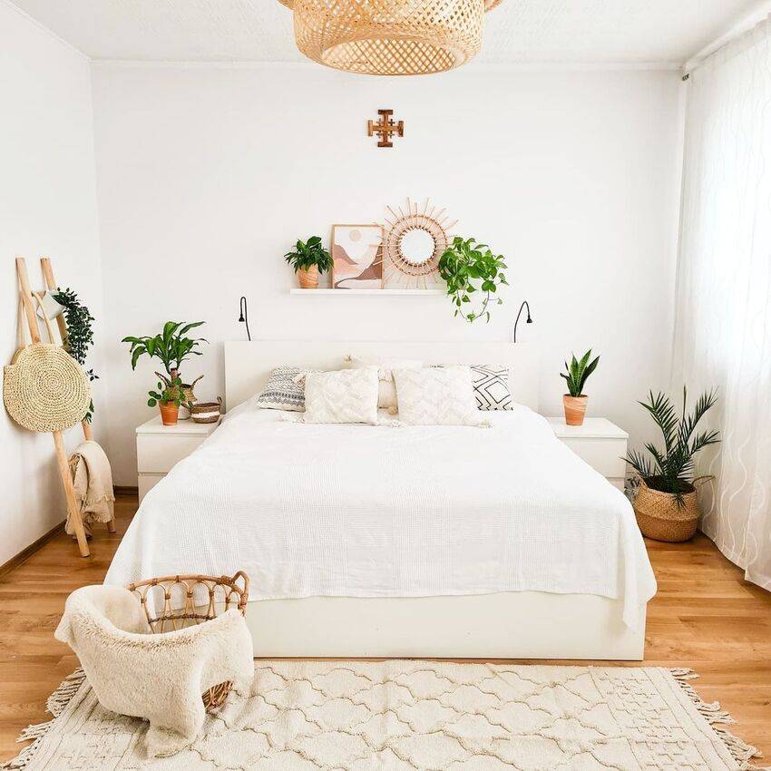 Чтобы спальня выглядела уютно, следует добавить текстурный текстиль, гирлянды или живые растения.