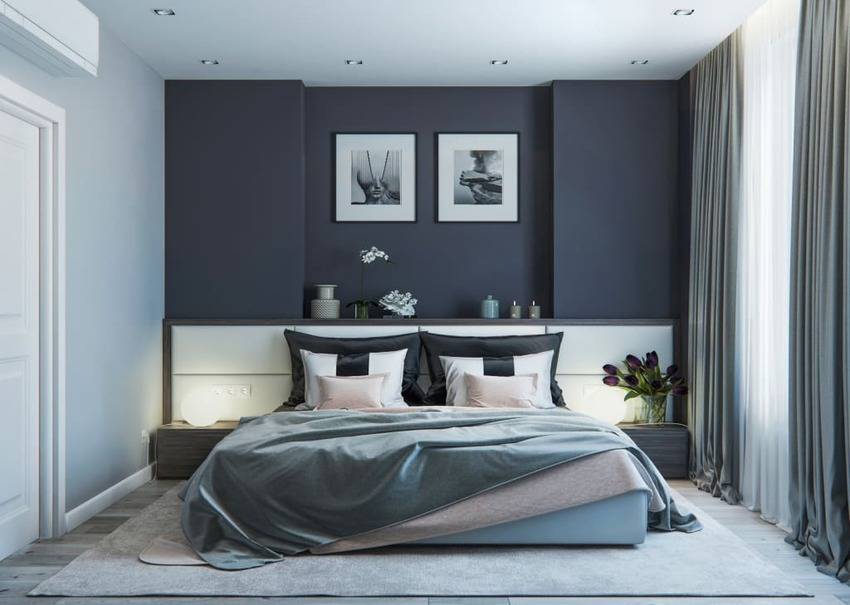 В оформлении спальни 9 кв.м. чаще всего выбирают однотонные стены в сочетании с небольшими яркими вкраплениями в интерьере. Также популярна игра контрастов, например, черного и белого.