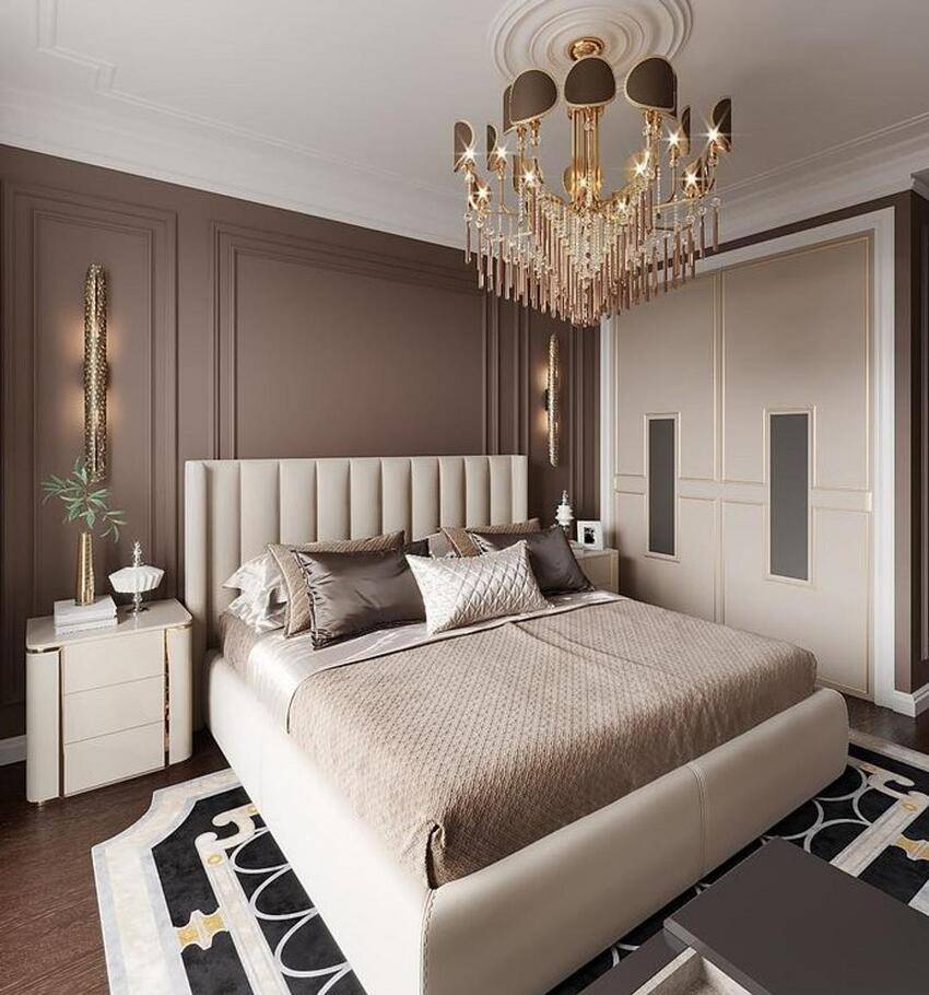 Классический стиль стремится создать уютную атмосферу за счет мягкого и гармоничного сочетания всей обстановки в спальне. Мебель часто выбирают в светлых или коричневых тонах. Для отделки используют нейтральный цвет — не белый, но и не слишком насыщенный. Также стены могут быть украшены декоративными плинтусами, лепниной.