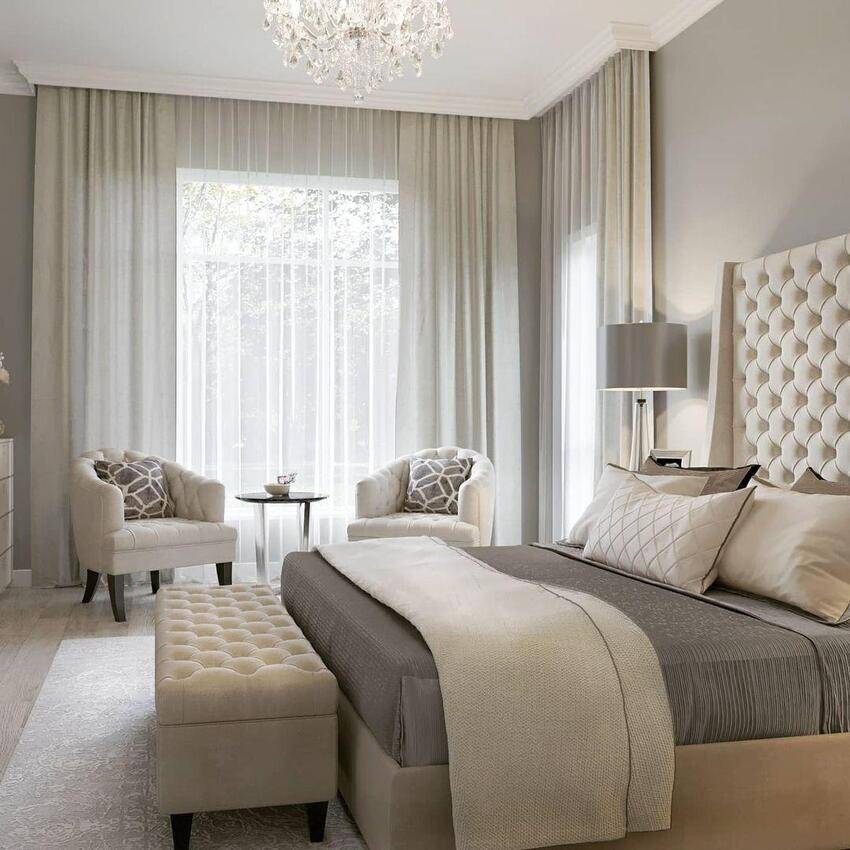 Поэтому по мере возможности стоит отказаться от тюля или даже от штор. В качестве компромисса используй занавески нейтрального цвета. Если в спальне есть выход на балкон, то имеет смысл поставить большие окна в пол.