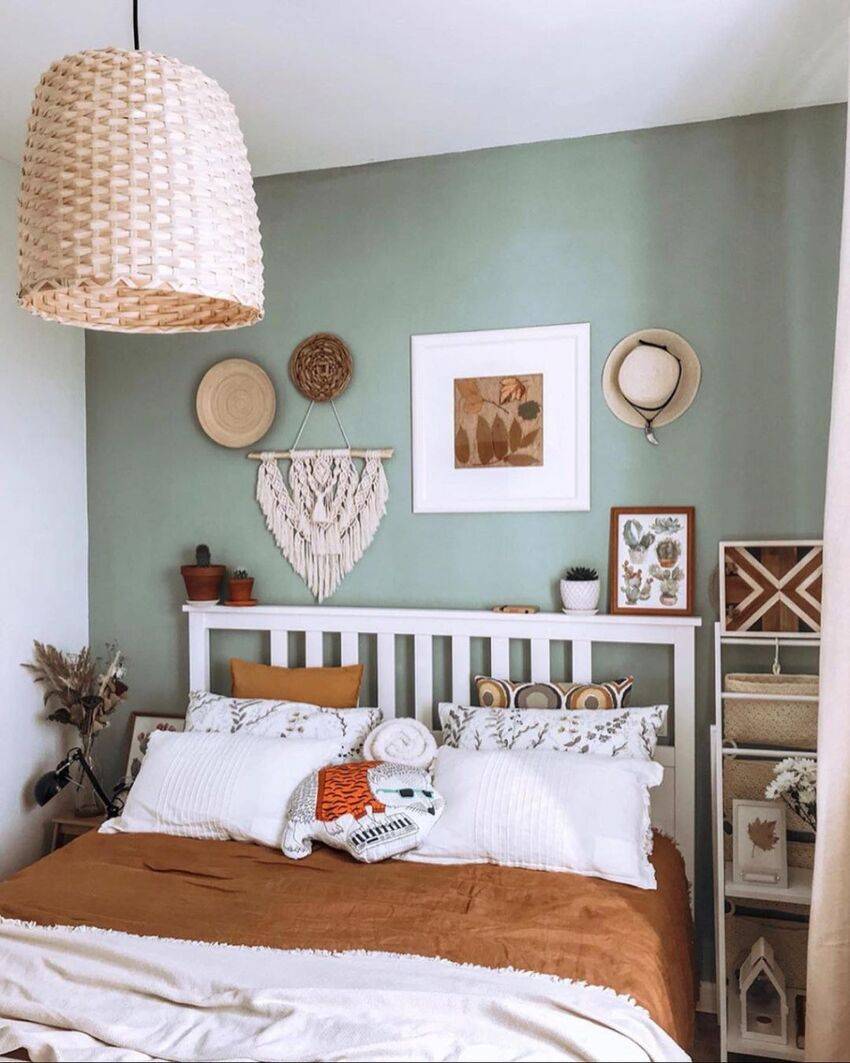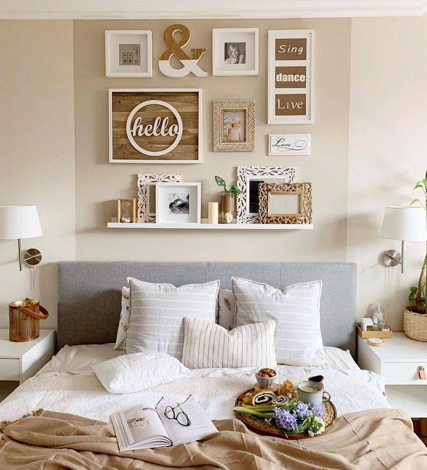Такой дизайн отлично подойдет для маленькой спальни. Чтобы обыграть комнату, выберите необычное изголовье для кровати или подберите изображения, которые отражают ваши вкусы.