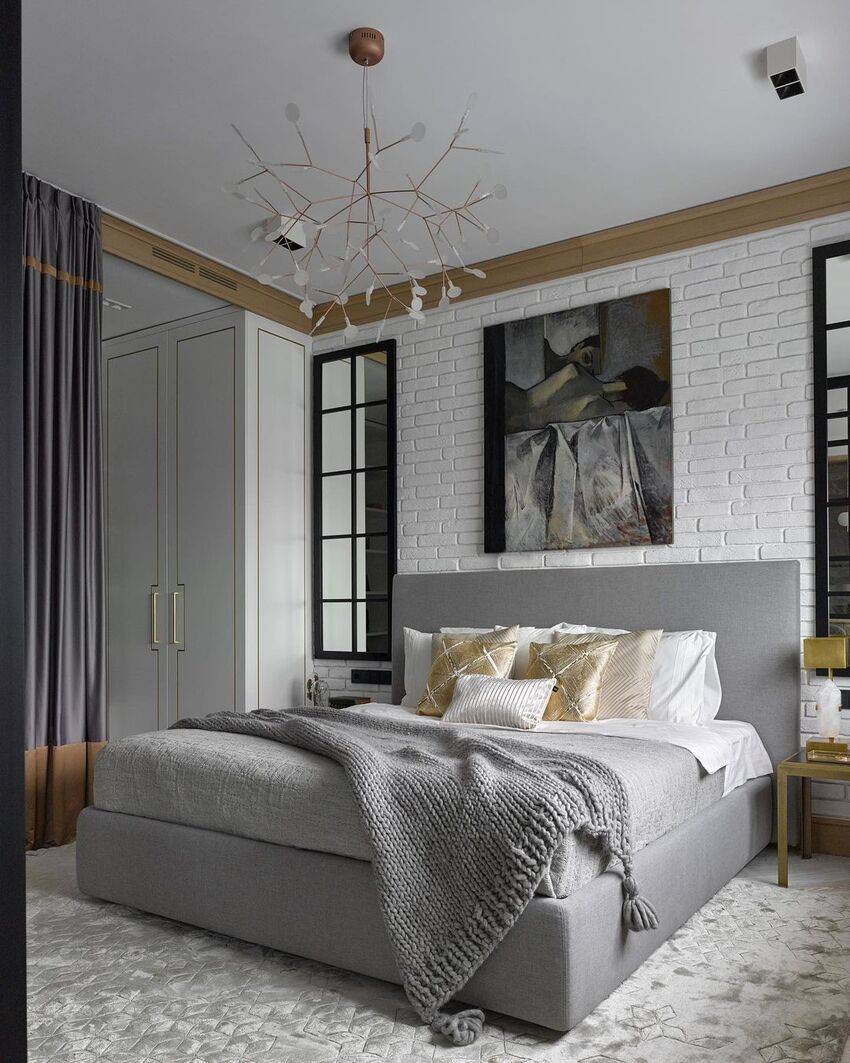 Однако выход есть – это современная классика. Остановись на главных постулатах стиля: пропорции и гармония. Сделай центром композиции кровать, а по ее бокам поставь две тумбы со светильниками.