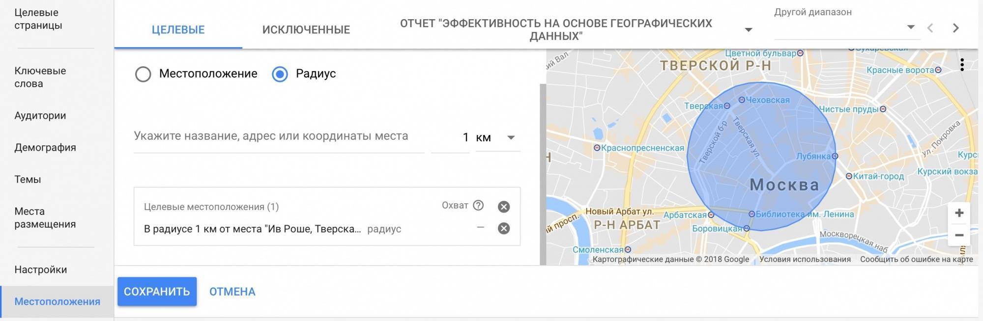 В Google Ads максимальная детализация таргетинга – радиус в 1 км вокруг заданных координат.